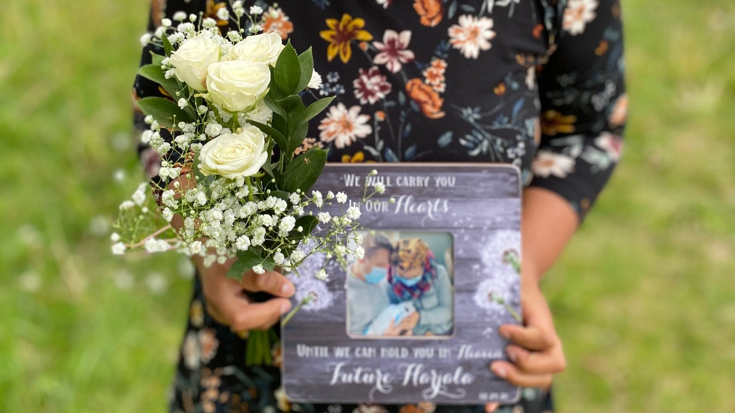 Holding my roses, and my baby at the Baby Steps Foundation event, May 2021.